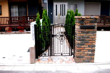 玄関アプローチとして周りをレンガで縁取りアウスクウォーツのローズベリー色の石を貼って、門扉を取り付けました。 レンガで門柱を作りポストとインターフォンを取り付けました。 玄関アプローチの脇には段違いでコニファーを植えました。