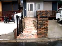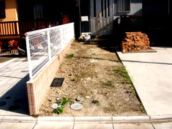 | ①施工前の写真です。 | ②玄関アプローチとして石を貼り、周りはレンガで縁取りました。 レンガで作った門柱にはポストとインターフォンを取り付けました。 |