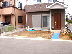 旦那さんのご希望で駐車スペースを大きめに作り、玄関アプローチは自然風に石を張って一段階段を作りました。照明は自動点滅に切り替えて、緑が少ないので全面に芝生を張りました。